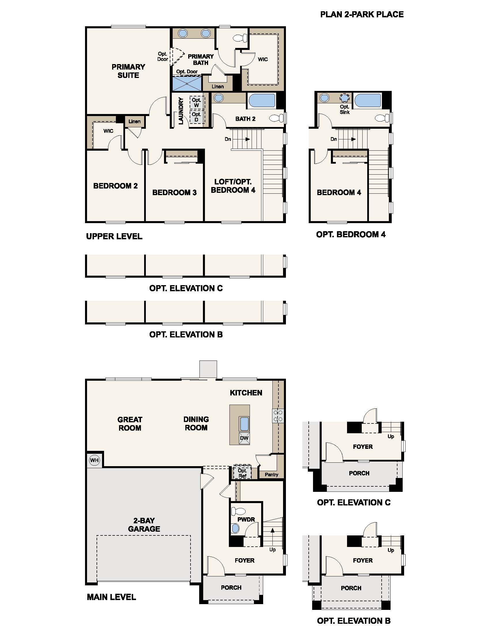 Plan 2 - 1945 at Park Place spans 1,945 square feet of living space across two well-appointed stories. The entrance foyer unfolds into a spacious open-concept great room, complete with a dining area, living space, and a kitchen featuring an island and a generous corner pantry. A half bathroom and additional storage enhance the first floor's functionality. Upstairs, a versatile loft serves as a central communal space, connecting the home’s three bedrooms, including a luxurious primary suite with a five-piece en-suite bathroom, boasting a dual-sink vanity, private water closet, shower and a walk-in closet. Two more bedrooms share a full bathroom, complemented by a convenient upstairs laundry room. A two-bay garage adds the finishing touch to this thoughtfully designed home.