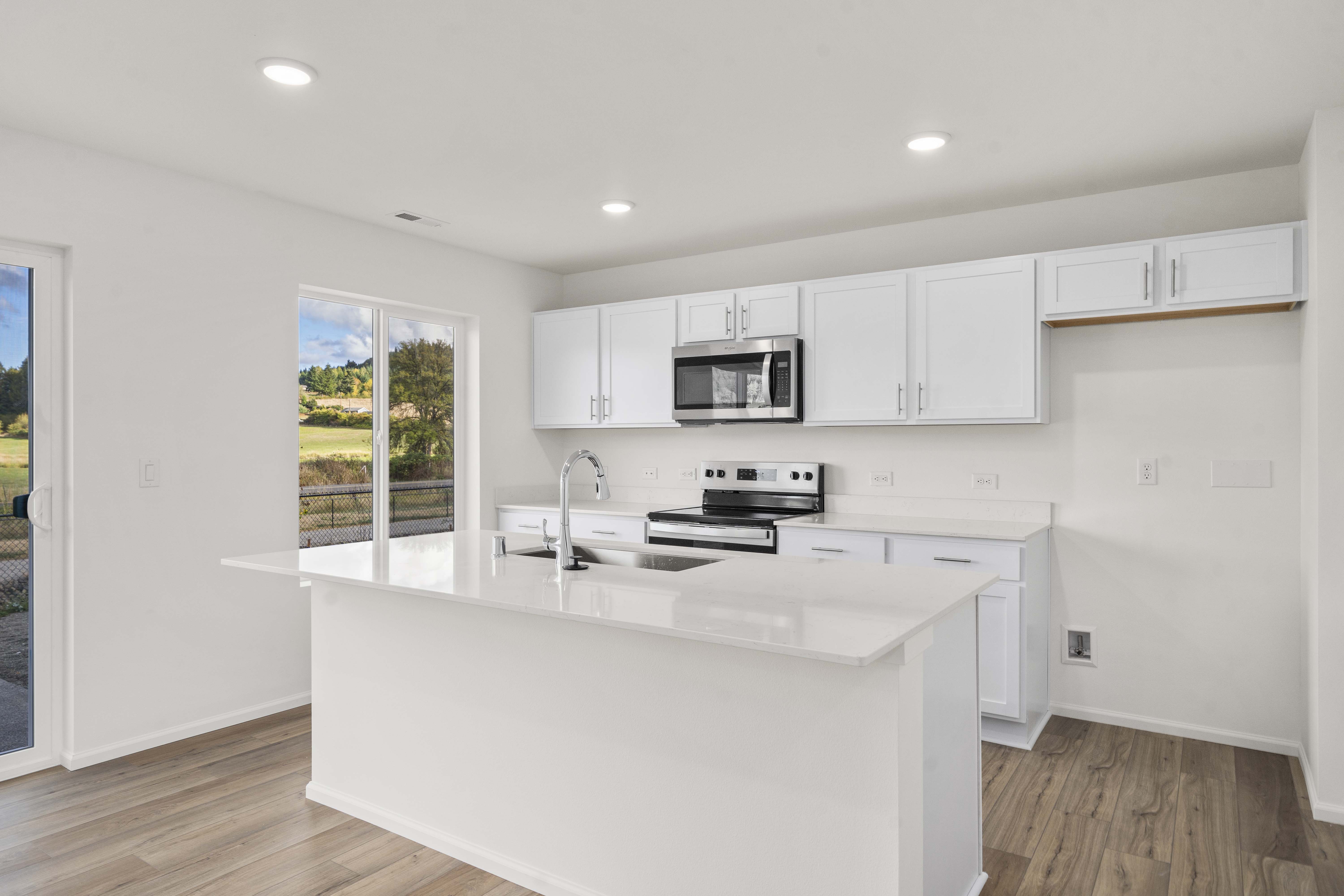 Showcasing thoughtfully designed two-story floor plans, these homes highlight modern features that blend comfort and innovation. Enjoy stylish quartz countertops in the kitchen and primary suite, premium stainless-steel appliances—including a electric cooktop with a 36” wall-mount range hood and smart Wi-Fi oven/microwave combo—plus 34.5-inch cabinets with molding, soft-close doors, pulls, and under-cabinet lighting.