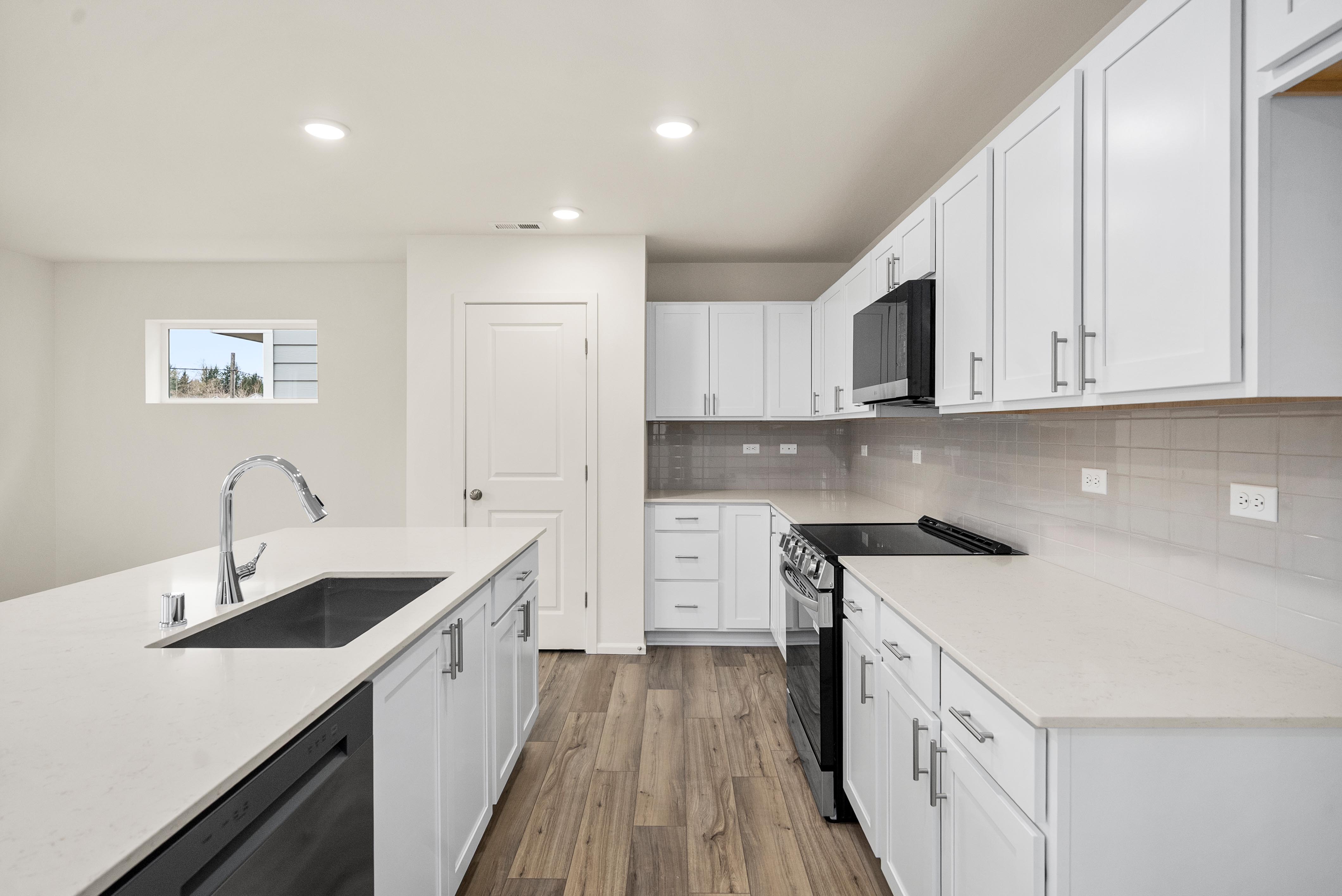 Showcasing thoughtfully designed two-story floor plans, these homes highlight modern features that blend comfort and innovation. Enjoy stylish quartz countertops in the kitchen and primary suite, premium stainless-steel appliances—including a electric cooktop with a 36” wall-mount range hood and smart Wi-Fi oven/microwave combo—plus 34.5-inch cabinets with molding, soft-close doors, pulls, and under-cabinet lighting.